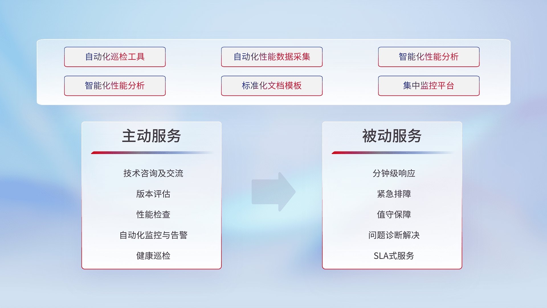 智能化工具和标准化文档,,保障服务质量,,提供主动服务(包含技术咨询、、、、版本评估、、、、性能检查、、自动化监控与告警、、、健康巡检)和被动服务包含(分钟级响应、、、紧急排障、、、、值守保障、、、问题诊断解决、、、SLA服务)。。。